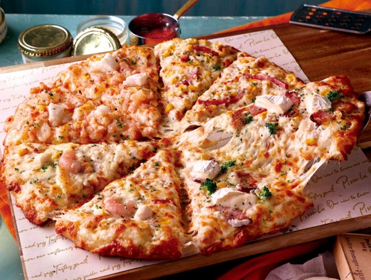 「大海老のガーリックシュリンプ」「テリヤキチキン」「ミート&マヨポテト」「濃厚ミートソース&厚切りベーコン」の4種類が1枚で楽しめるクォーターピザ。