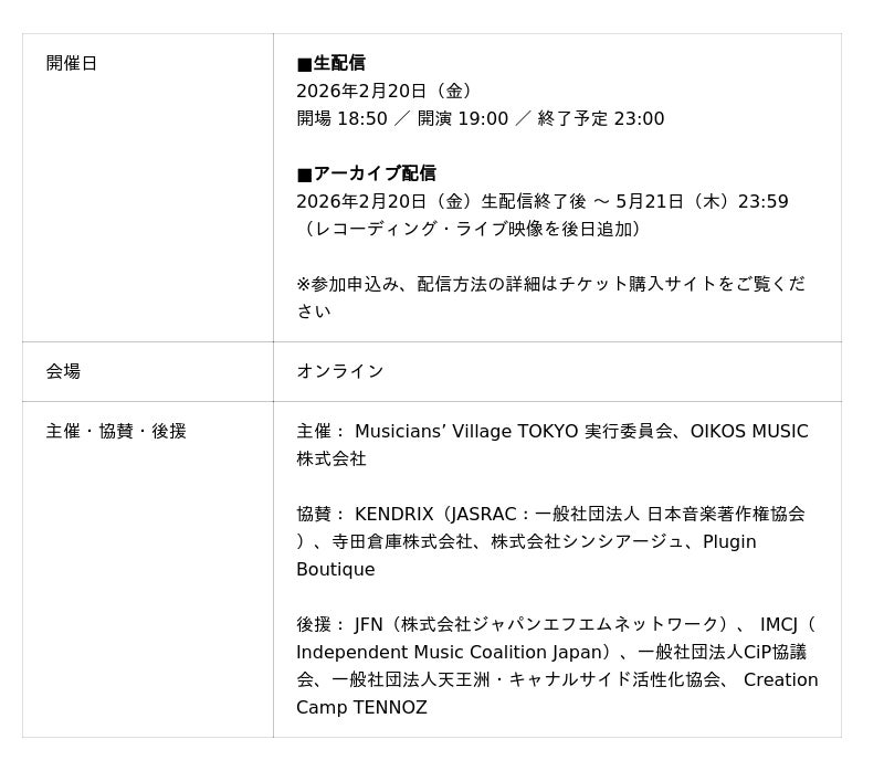 次世代を担う若手アーティストの育成と世界中のアーティストが集う創作活動の拠点を創るプロジェクト「Musicians’ Village TOKYO vol.6」を、2026年2月20日(金)にオンラインで開催する運びとなりましたのでお知らせします。