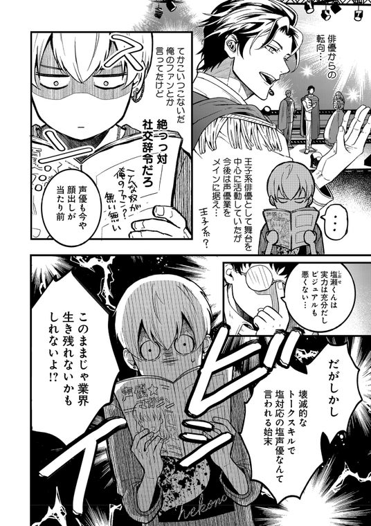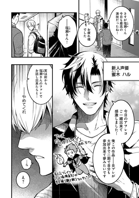 そんななか、新人人気声優・蜜木は塩瀬の大ファンらしく、塩瀬が冷たく返してしまってもめげずに話しかけてくる。