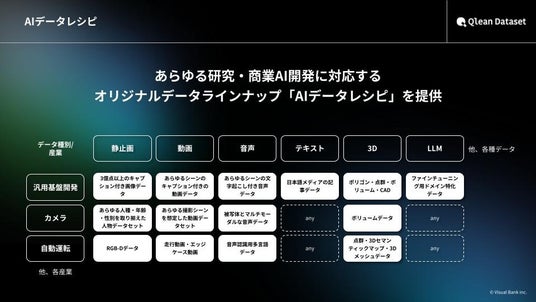 本データセットは、Qlean Datasetが提供するオリジナルデータラインナップ「AIデータレシピ」の一つとして提供されており、研究用途から商用AI開発までを見据えた権利処理が行われています。Visual Bankは、GENIAC採択企業として、日本の文化や産業に根ざしたデータ提供を通じ、AI開発現場における実装フェーズを支援してまいります。