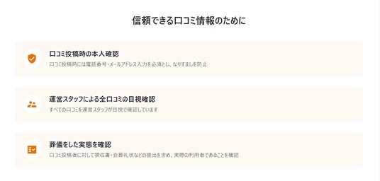 - 信頼できる口コミ:実際に葬儀を行った人からの口コミを掲載。投稿時に連絡先確認や証明書類の提出を求め、本物の利用者の声であることを確認しています。- 直接連絡:コールセンターなどを介さず、利用者が葬儀社と直接電話で話せます。
