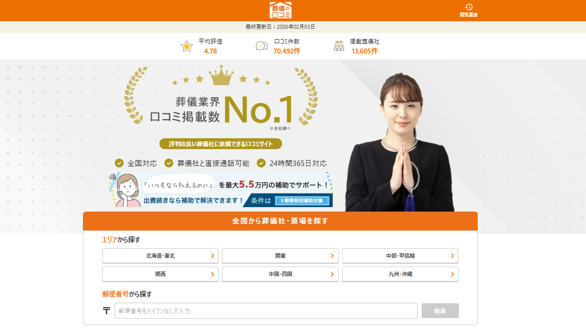 株式会社ディライト(本社:東京都新宿区、代表取締役:高橋亮)が運営する葬儀社比較サイト「葬儀の口コミ」の掲載口コミ件数が、2026年2月3日に70,000件を突破しました。