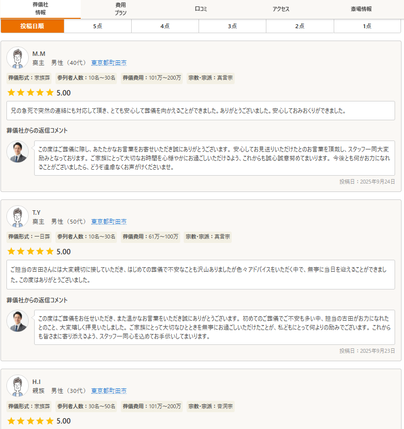 口コミに対する葬儀社からの返信を通じて、担当者の人柄や対応姿勢も事前に確認できます。