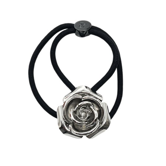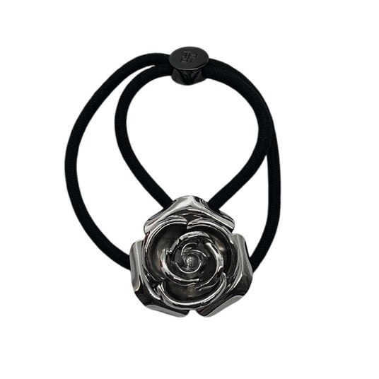 ローズ メタル ポニーは、ソリッドなメタルの輝きとシックなモノトーンで、薔薇のイメージをモダンかつクールにアレンジした独自のデザインです。立体的なオーナメントはさらりと結ぶだけで確かな存在感が。シンプルな単品使いも素敵ですが、色違いでの重ね付けや、同シリーズの他アイテムとのコーディネイト、またシニヨンをラッピングするアレンジもおすすめ。ジュエリー風のモチーフは手首にブレスレット風に着けても楽しめ、ギフトにも最適です。