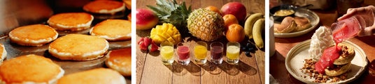 店内には、パンケーキが焼き上がる様子を目の前で楽しむことができる、ライブ感たっぷりの「パンケーキバー」を用意。香ばしい香りとともに、焼きたてならではの臨場感をお楽しみいただけます。パンケーキは一枚からご注文可能。素材の味をシンプルに堪能するのはもちろん、目の前でバーナーを使って仕上げるトリュフバターのトッピングや、ご注文ごとにブレンダーでつくるフレッシュなフルーツソースとの組み合わせもおすすめです。その日の気分やシーンに合わせて、思い思いの焼きたてパンケーキをお楽しみください。