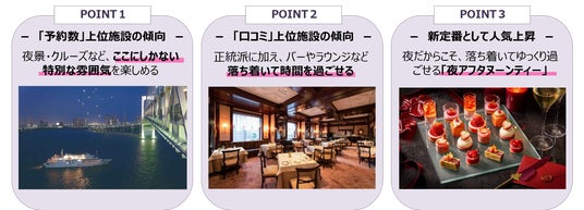 昼間に提供されることがスタンダードな「アフタヌーンティー」ですが、夜のアフタヌーンティーを提供する店舗も口コミ上位に見られ、特に暑さの厳しかった夏場には、昼間の外出を控え涼しい夜にゆったり過ごすニーズが高まったと言えます。