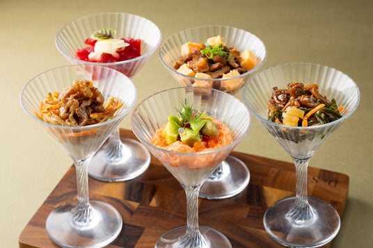 マグロや明太子玉子焼き、つくだ煮、本わさび、刻みアナゴなど、各地の海の幸・山の幸をお客様のお好みで盛り込んでお楽しみいただける食事系創作パフェ。