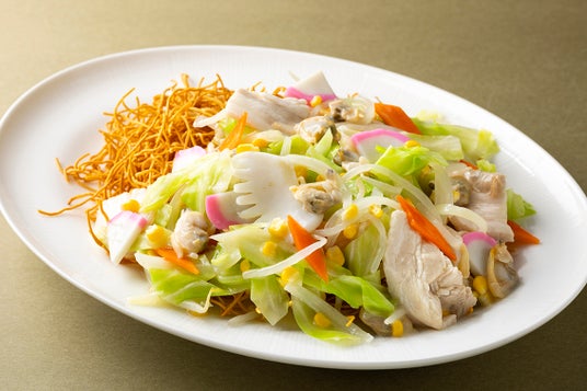 長崎県を代表する郷土料理。パリパリに揚げた細麺に肉・魚介・野菜など豊富な食材をたっぷり入れた餡を麺にかけた一皿。