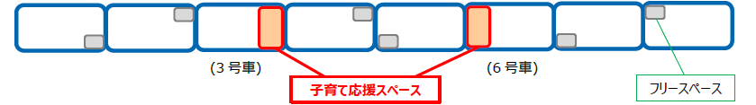 「子育て応援スペース」は、小さなお子様連れのお客様だけでなく、お年寄りや車いすをご利用の方など、どなたでもご乗車いただけるスペースです。皆様のご理解とご協力をお願いいたします。