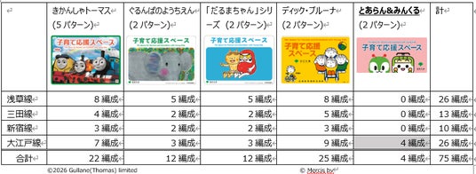 これまで、「きかんしゃトーマス」や「だるまちゃん」シリーズをはじめとした4シリーズのデザインを展開してきましたが、このたび大江戸線に、東京さくらトラム(都電荒川線)マスコットキャラクター「とあらん」と、都バスマスコットキャラクター「みんくる」が登場する子育て応援スペースを設置いたします。