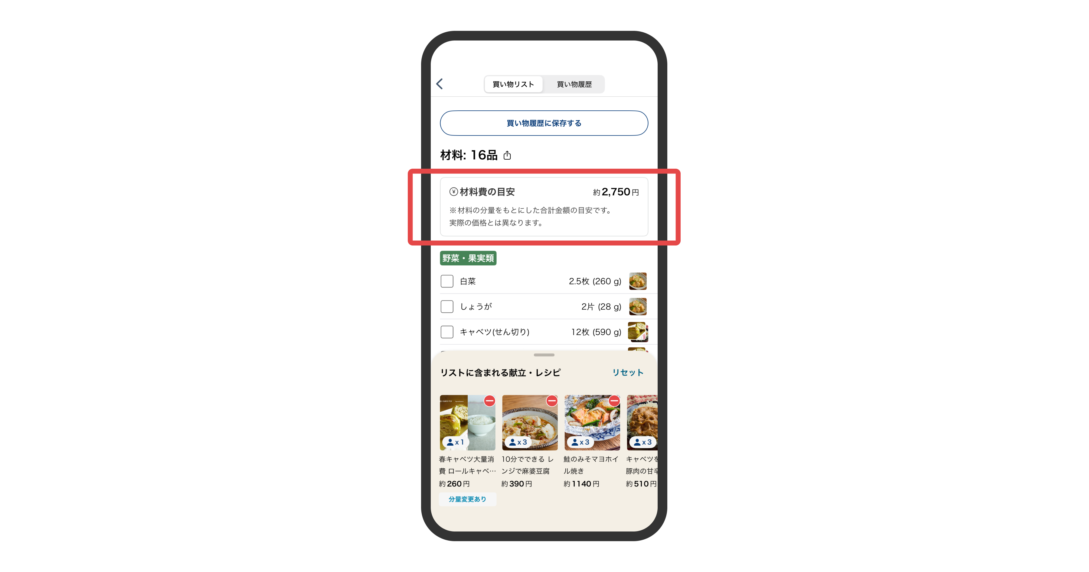 買い物リストに登録されている人数分の材料の分量をもとにした合計価格の目安になります。