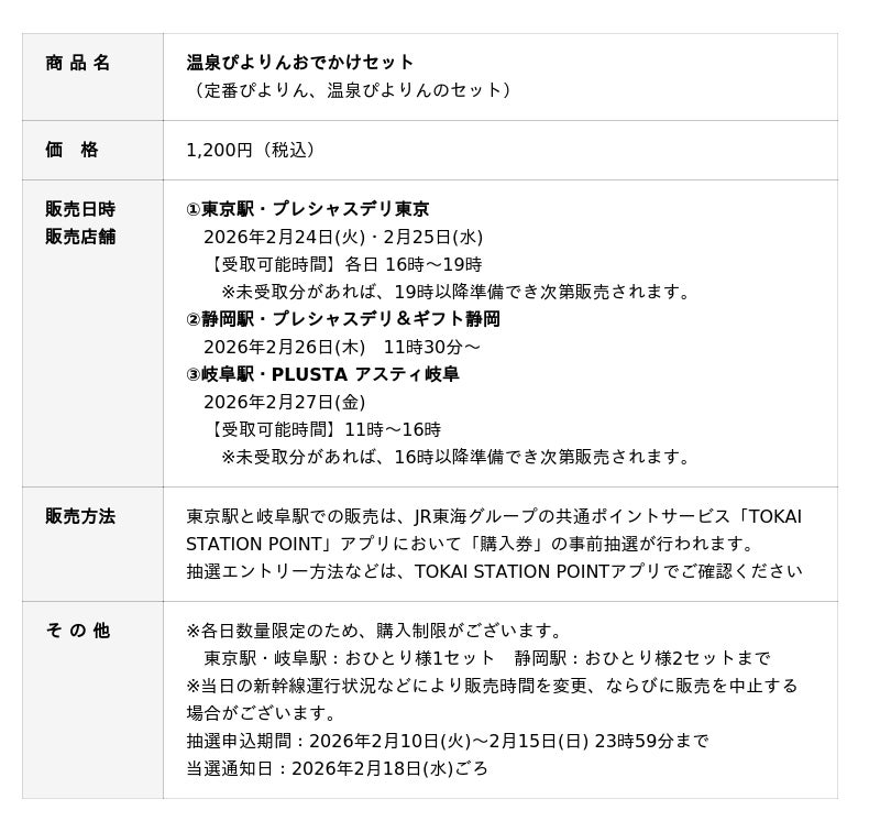 ジェイアール東海フードサービス株式会社(本社:愛知県名古屋市、代表取締役社長 岩下賢一)のオリジナルスイーツ「ぴよりん」と「心も体も癒やされる温泉旅」をテーマにした「ぴよりんのほっこり温泉旅フェア」が、株式会社JR東海リテイリング・プラス(所在地:愛知県名古屋市、代表取締役社長:小林 創)の店舗で、2026年2月10日(火)から開催されます。