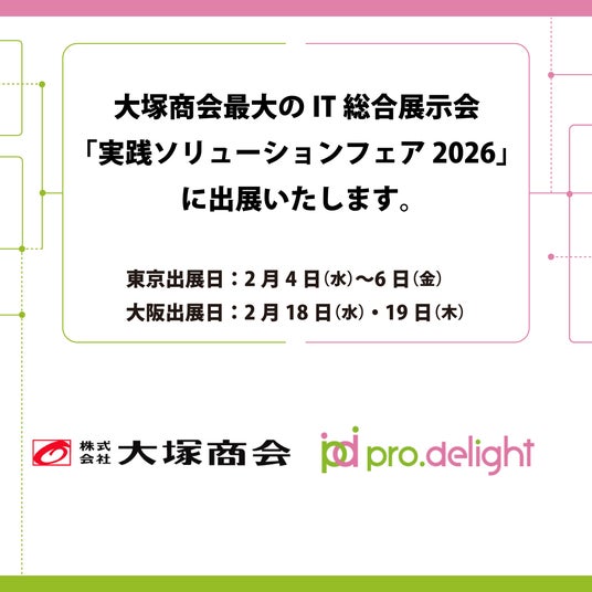 電話のDXを推進する株式会社プロディライト(大阪市中央区:代表取締役社長 小南 秀光、証券コード:5580、以下プロディライト)は、株式会社大塚商会(本社:東京都千代田区、代表取締役社長:大塚裕司、以下大塚商会)主催のIT総合展示会「実践ソリューションフェア 2026」に2月4日(水)~6日(金)は東京会場、2月18日(水)・19日(木)は大阪会場にて出展いたします。