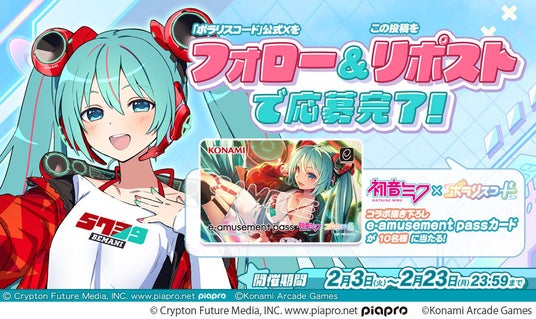 株式会社コナミアーケードゲームスは、音楽ゲーム『SOUND VOLTEX ∇(サウンドボルテックス ナブラ)』と『ポラリスコード』にて、クリプトン・フューチャー・メディア株式会社が制作するバーチャルシンガー・ソフトウェア『初音ミク(はつねみく)』とのコラボレーションイベントを2月5日(木)から開始することをお知らせします。