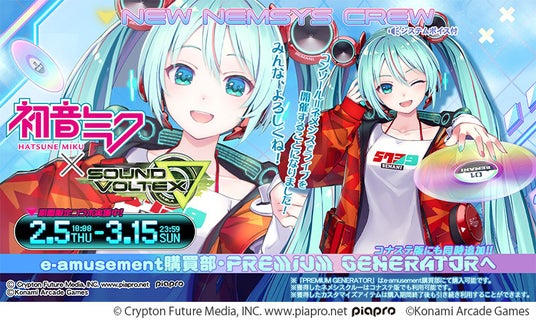 『SOUND VOLTEX ∇』では、『初音ミク』の「システムボイス付きネメシスクルー」や、ボイス付き「アピールスタンプ」などが登場する期間限定「PREMIUM GENERATOR(プレミアムジェネレーター)」が「e-amusement購買部」に登場します。さらに、期間中「アピールカード」や「アピール称号」などが貰える「コラボスタンプボーナス」も実施します。