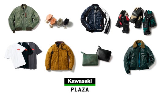 カワサキブース内、カワサキプラザアパレルコーナーではモーターサイクルライフを彩る多数のカワサキプラザアパレルを展示・販売。ぜひ、こだわりのオリジナルアイテムを手に取ってお確かめください。