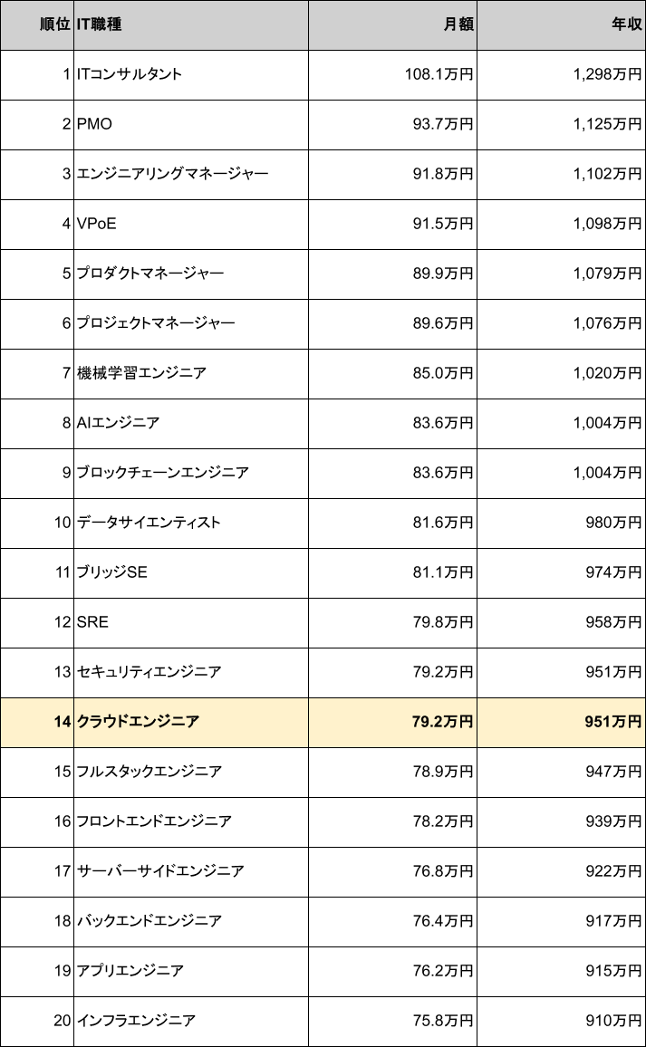 クラウドエンジニアの職種別平均年収ランキングは14位(951万円)