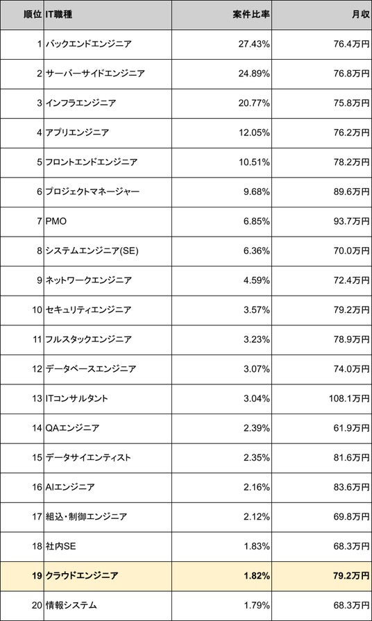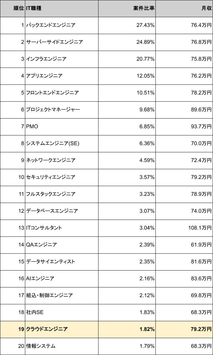 クラウドエンジニアの職種別案件数ランキングは19位(案件比率 1.82%)