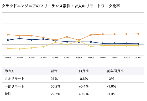 2026年2月時点のクラウドエンジニア向けフリーランス案件・求人におけるリモートワーク比率は、フルリモートが27%、一部リモートが50.2%、常駐が22.7%となっています。