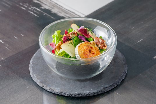 林檎の酸味と胡桃の食感をアクセントにしたサラダに、山羊乳を使用した爽やかで上品な風味のシェーブルタイプをほどよくキャラメリゼして合わせました。