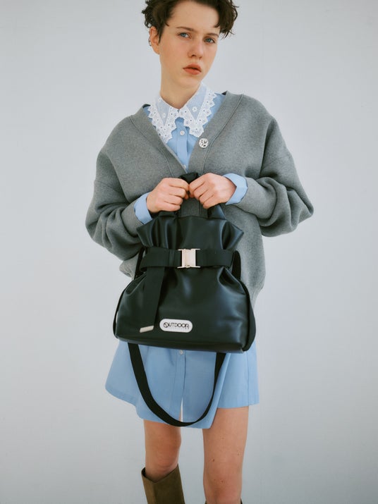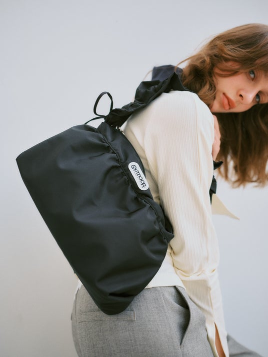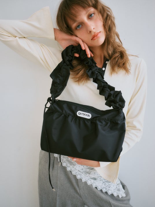 ギャザーを効かせたショルダーがポイントの、程よくラフなショルダーバッグ。コードを絞ってくしゅっとさせることで、スタイリングにさりげないニュアンスをプラス。