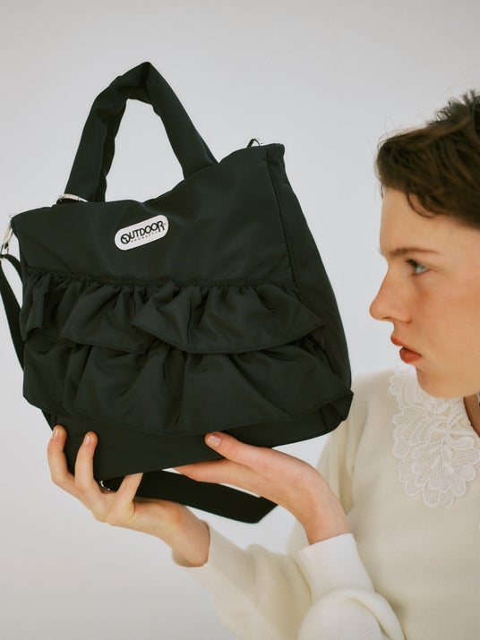 フロントに施した立体的なフリルがポイントで、シンプルなコーディネイトにさりげなく可愛らしいアクセントを添えます。程よくハリのある素材感で、ON・OFF問わずさらっと持ちやすく、大人でも取り入れやすいデザインに仕上げました。取り外し可能なショルダーストラップ付きで、手持ちと肩掛けの2WAYで使用可能。