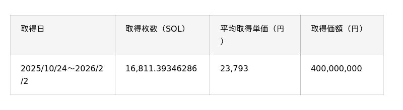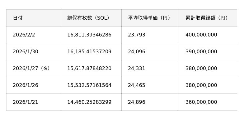 当社は引き続き、当初予定している5億円規模のSOL取得に向けて、市況を踏まえた適切なタイミングでの購入を進めるとともに、中長期的なSOLの価値向上を見据え、ステーキングやバリデータ運用をはじめとした施策を通じて、保有するSOL数量の拡大を図ってまいります。