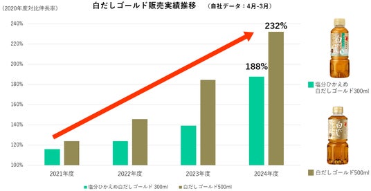 近年、白だしの汎用的な用途への理解が広がり、日常の調理における利用機会が拡大した結果、白だし市場は伸長を続けています。市場の拡大に伴い、自社商品も2020年度対比で「白だしゴールド」は232%、「塩分ひかえめ白だしゴールド」は188%と高い伸長率となっており、お客様より支持をいただいております。