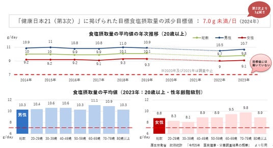 日本人の食塩摂取量を減少させることは継続的な社会課題となっており、近年では健康意識への高まりからも減塩が注目されています。国の「健康日本21(第三次)」における食塩摂取量の目標値(2024年までに7.0g未満/日)に対し、2023年時点での平均摂取量は9.8gと、目標達成には更なる啓蒙活動や商品開発が期待されています。