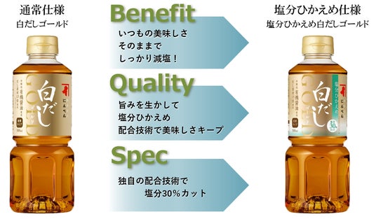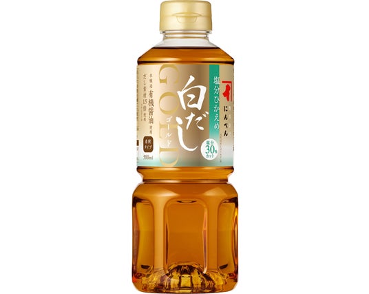 株式会社にんべん(東京都中央区、代表取締役社長 高津伊兵衛)は、ゴールドシリーズ「塩分ひかえめ白だしゴールド」を300mlから500mlへ容量変更し、2026年3月1日(日)に全国でリニューアル発売いたします。近年、白だし市場が伸長傾向にあり、さらに食塩摂取量の削減が推奨される中、「塩分ひかえめ白だしゴールド」の販売実績は好調に拡大しています。こうした市場環境とお客様からのご好評を受け、従来のトライアルサイズ(300ml)から容量を増量し、より高まる需要にお応えできるようにリニューアルいたしました。本醸造有機醤油と国内製造・国産のだし素材をレギュラー品(当社「白だし」)の1.5倍使用し、美味しさはそのままに塩分を30%カット。減塩を意識した食卓をしっかりとサポートします。
