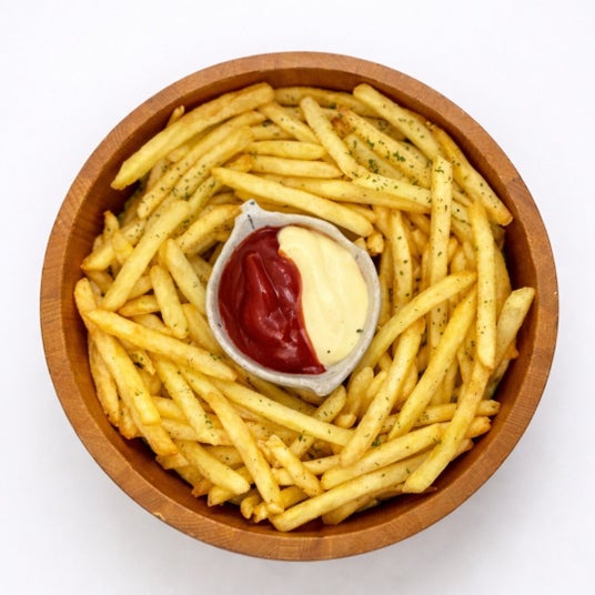 風呂桶から、揚げたてのポテトフライをあふれんばかりに盛り付けた大盛ポテトフライ。
