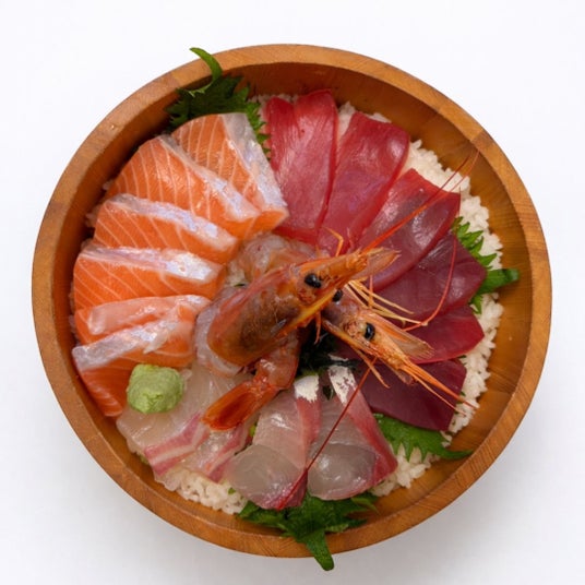 風呂桶から、マグロ・サーモン・海老・カンパチ・白身をどっさりと盛り付けた大漁海鮮丼。