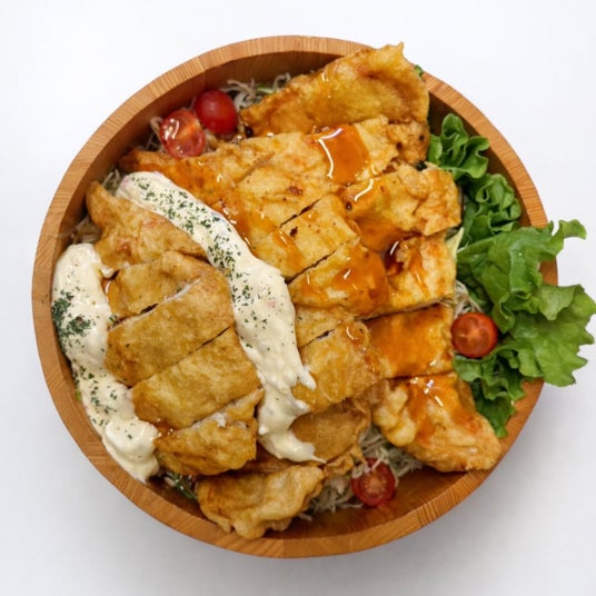 風呂桶から、ジューシーなチキン南蛮を豪快に三倍盛りにしたトリプルチキン南蛮。