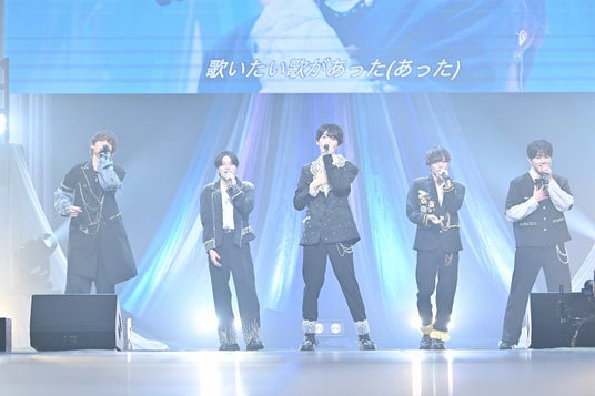 トップバッターは、2025年6月に結成し、半年を迎えたNEWSTAR。まっすぐで王道のラブソング『星降る夜の法則』を愛らしい笑顔と共に届けていく。それぞれの胸キュンセリフが散りばめられた、5人のバランスのいいパフォーマンスが魅力的だ。さらにコール&レスポンスで盛り上がる『フェステバルーンハート』や、シャボン玉が飛ぶステージで『humming』を披露した後、一ノ瀬が「僕たちの魅力をお伝えしたいということで次の曲です」という曲振りで始まった『愛してるぜ、ミステリー』では、スリリングなサウンドを妖艶な姿で魅せ、メンバー同士が唇を近づける仕草に歓声が上がっていく。一転、『今すぐKiss Me』では電車ごっこのようなかわいい振り付けで花道をかけぬけ、キュートに、そしてたまにクールにパフォーマンス。メンバー同士でほっぺにツンツンとしたり、笑いあったりと、仲の良さが伝わってくるステージだった。そしてグループラストの曲『Noam ~魔法がとける、その前に。~』では、梅本が魔法をかけて操るようなパフォーマンスを魅せドラマティックに展開する楽曲をエネルギッシュに披露し、会場を盛り上げた。