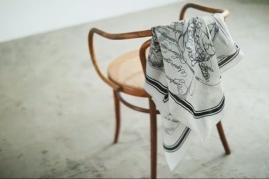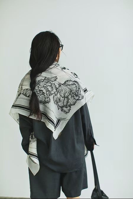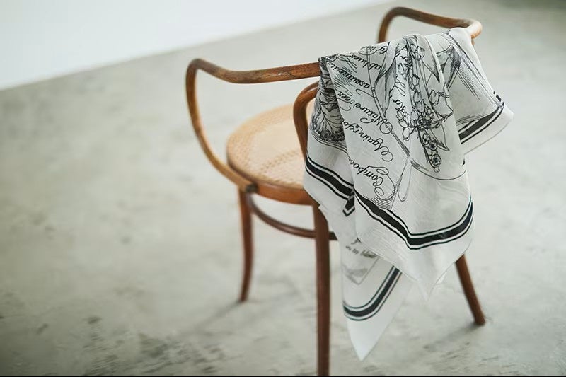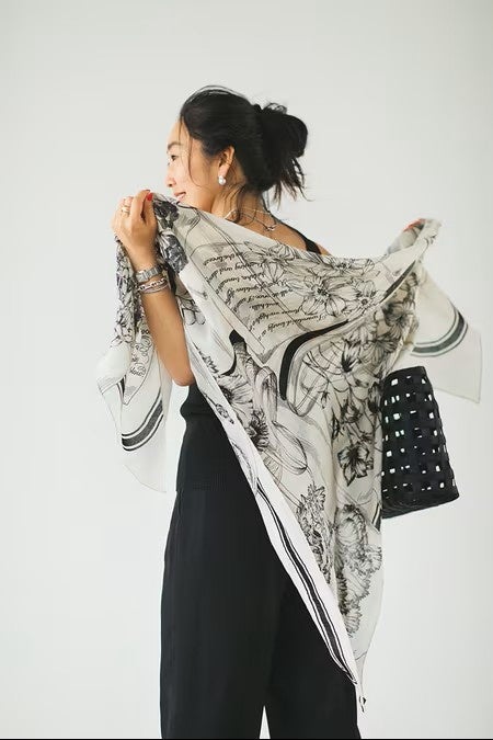 今回、スタイリストの福田麻琴さんが豊富な柄の中からミモレのためにセレクトしたのは、爽やかな白ベースのモノトーン柄。大判サイズでありながらしなやかで、ちょっと肌寒い春先の羽織りにもぴったりの一枚です。