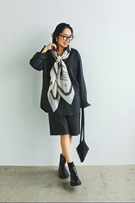 柄ストールというとエレガントなイメージがあるかもしれませんが、これはシルクのまろやかな艶とコットンのドライな質感のバランスが絶妙で、サイドゴアブーツやハーフパンツなどカジュアルなアイテムとも馴染み良し。マダムっぽくなりすぎず、どこかクールに仕上がるところが気に入っています。(福田真琴さん)