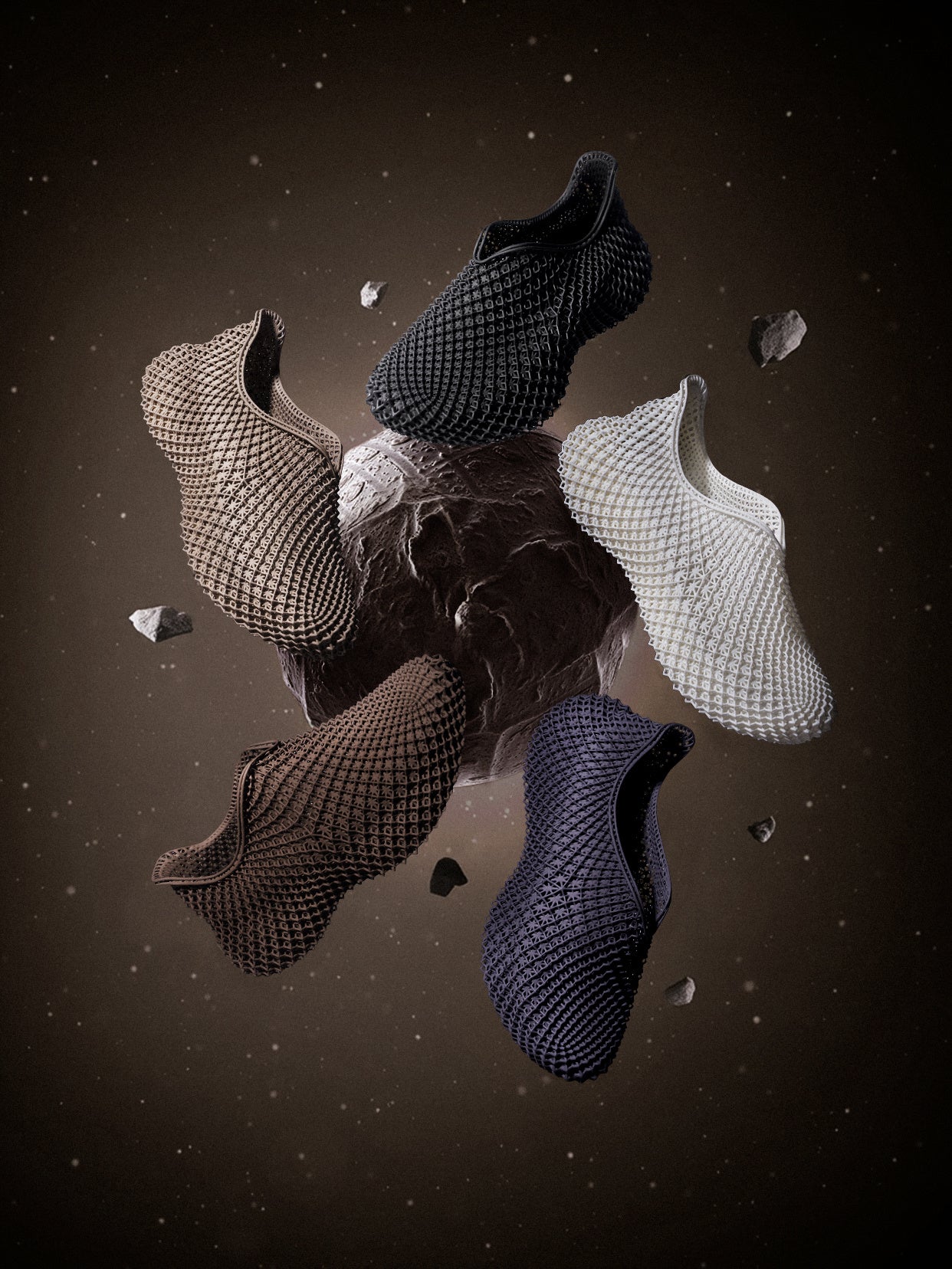 3Dプリント技術を用いた次世代フットウェアブランドです。独自のHALS超高速光硬化方式により、従来の製法では実現が難しかった接着剤を使用しない一体成形構造を可能にし、軽量性・通気性・耐久性を高次元で両立したシューズを展開しています。