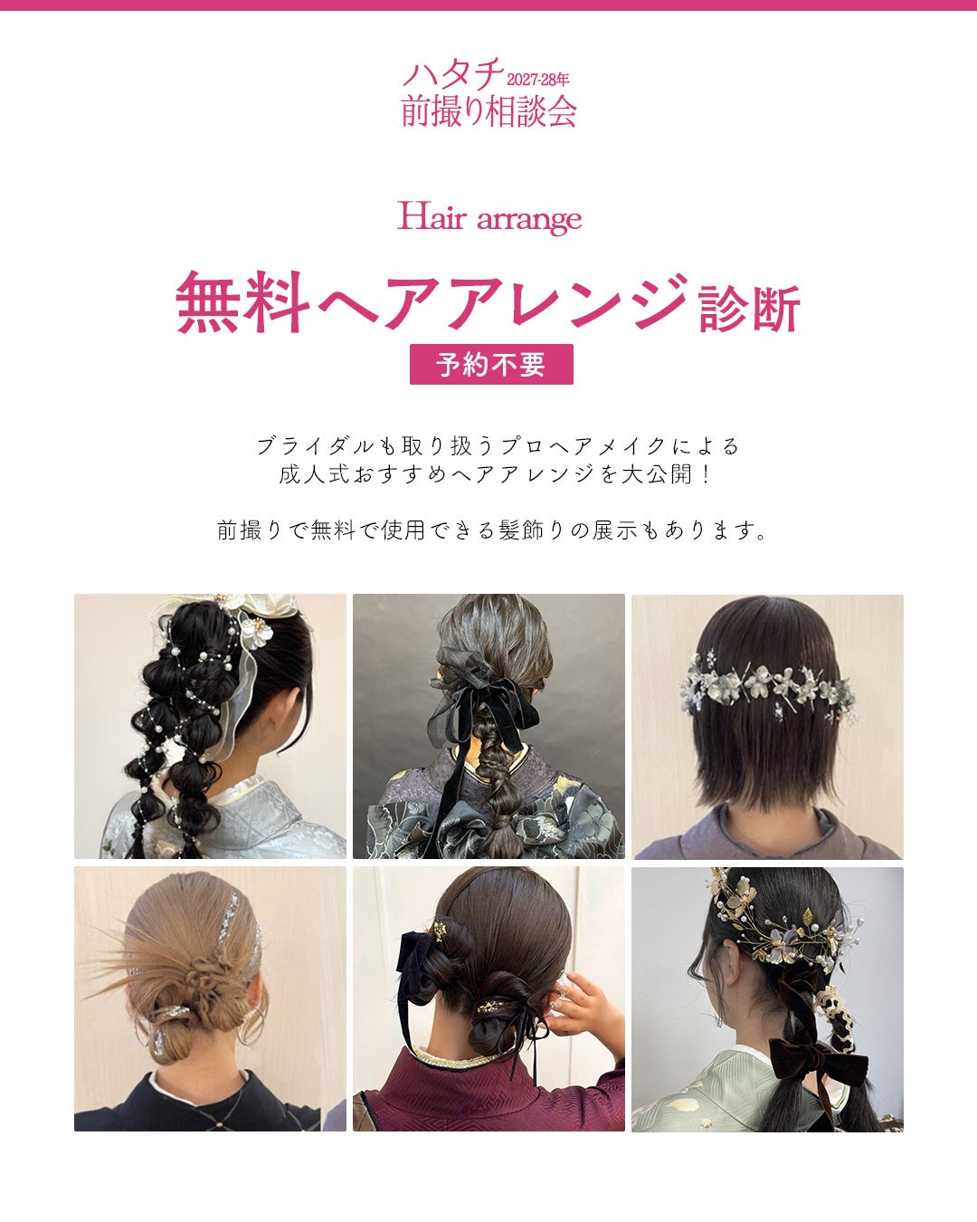 2027~2028年成人必見!写真工房ぱれっとの前撮り相談会。新作振袖100着以上&無料ヘア診断など特典満載。「写真だけの成人式」におすすめ。