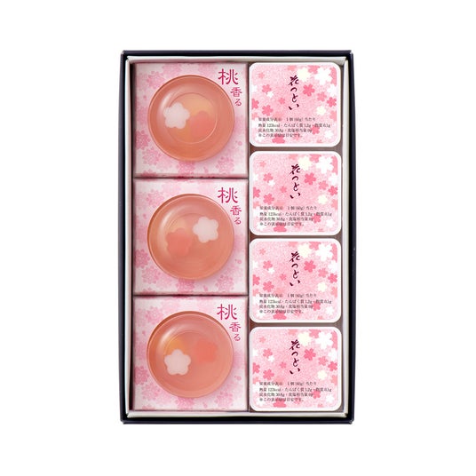 「吉野本葛」を使用した和風ゼリーに国産白桃の果肉をこめて、桃の花の形にくりぬいた2色の羊羹をあしらいました。ぷるんとなめらかな口あたりに桃の優しい香りが広がる、食べごたえたっぷり、春だけの美味しさをお楽しみいただけます。