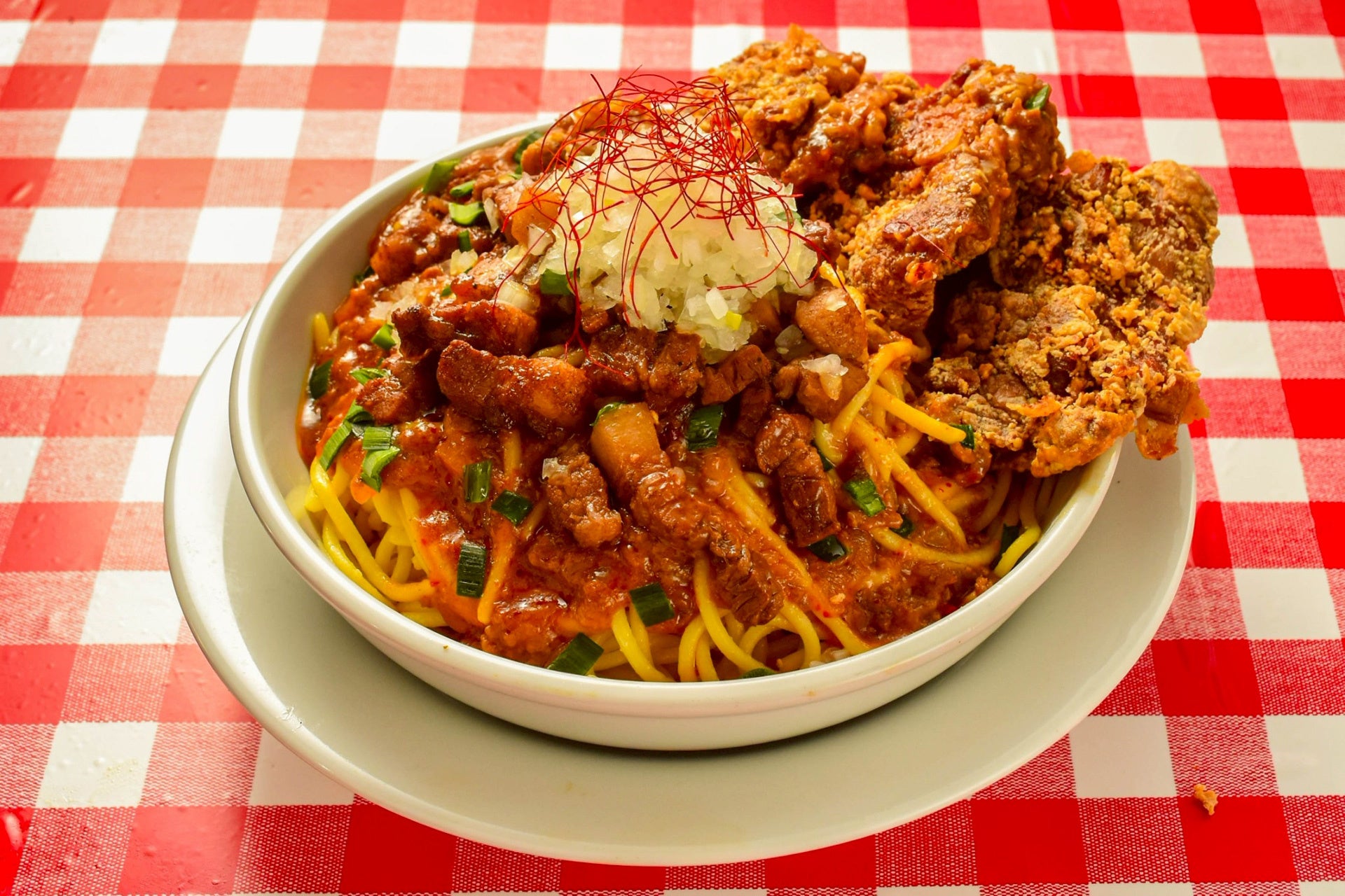 なお試作当初、鶏唐揚げ「鶏排(ジーパイ)」はトッピング1個を予定していましたが、「唐揚げは1個じゃ悲しいから、2個でお願い!」とさち姉の希望で大きな唐揚げ2個もトッピングしちゃいます。