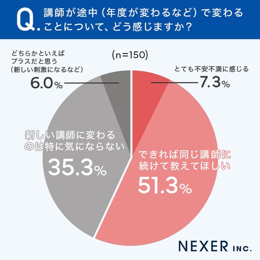 51.3%が「できれば同じ講師に続けて教えてほしい」、35.3%が「新しい講師に変わるのは特に気にならない」と回答しました。