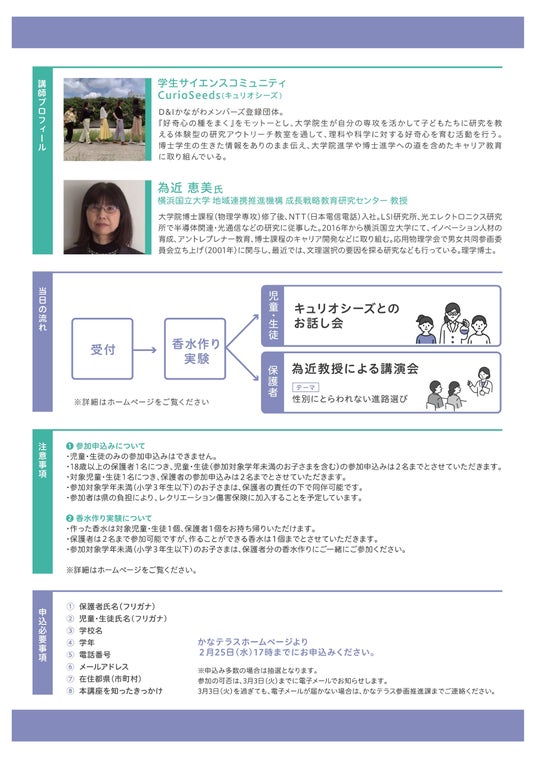 「保護者と一緒に!子どもミライ教室~香水作り実験&大学教授・大学院生とお話し会~」のチラシです。
