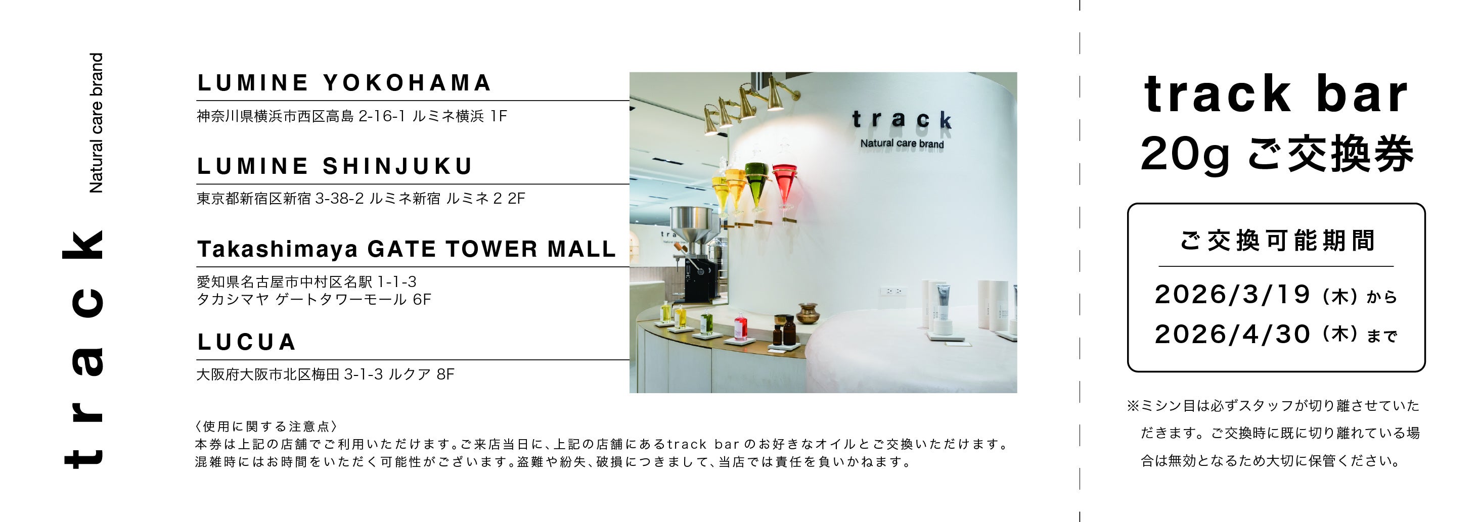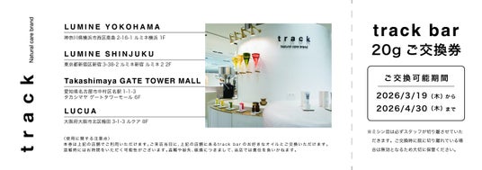 2.期間中、11,000円(税込)以上お買い上げいただき、Instagram(@track_jp)のフォロー画面をご提示いただくと、4店舗で使用できるtrack bar 20gご交換券をプレゼントいたします。気になるオイルをお試しすることができるチャンス。この機会にぜひご利用ください。※その場でフォローいただいた方も対象です。