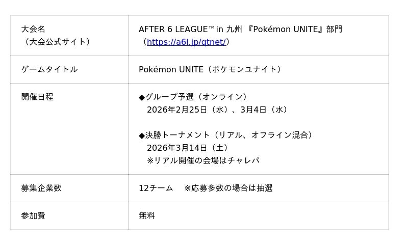 現在、記念すべき第1回大会となる「AFTER 6 LEAGUE(TM) in 九州 Pokemon UNITE部門」の参加企業エントリーを受付中です。会社の仲間と一緒に大会に出場しませんか?皆さまのエントリーをお待ちしております。
