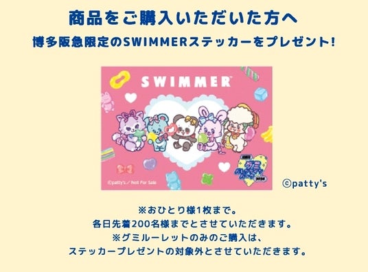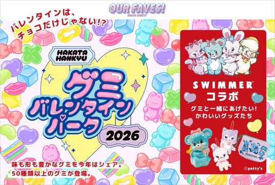 アイピーフォー株式会社(本社:東京都豊島区、代表取締役社長:小濱 剛)がライセンスを取り扱っている大人気雑貨ブランド「SWIMMER」が、博多阪急で行われるイベント「グミバレンタインパーク」とコラボレーション!SWIMMERデザインのグミの持ち帰りBOXや特典のほか、バレンタインにグミと一緒に贈りたくなるようなSWIMMERのグッズコーナーも展開(ハート)2026年2月4日(水)~2月14日(土)まで、博多阪急1階 メディアステージにて開催です。ぜひチェックしてみてください♪