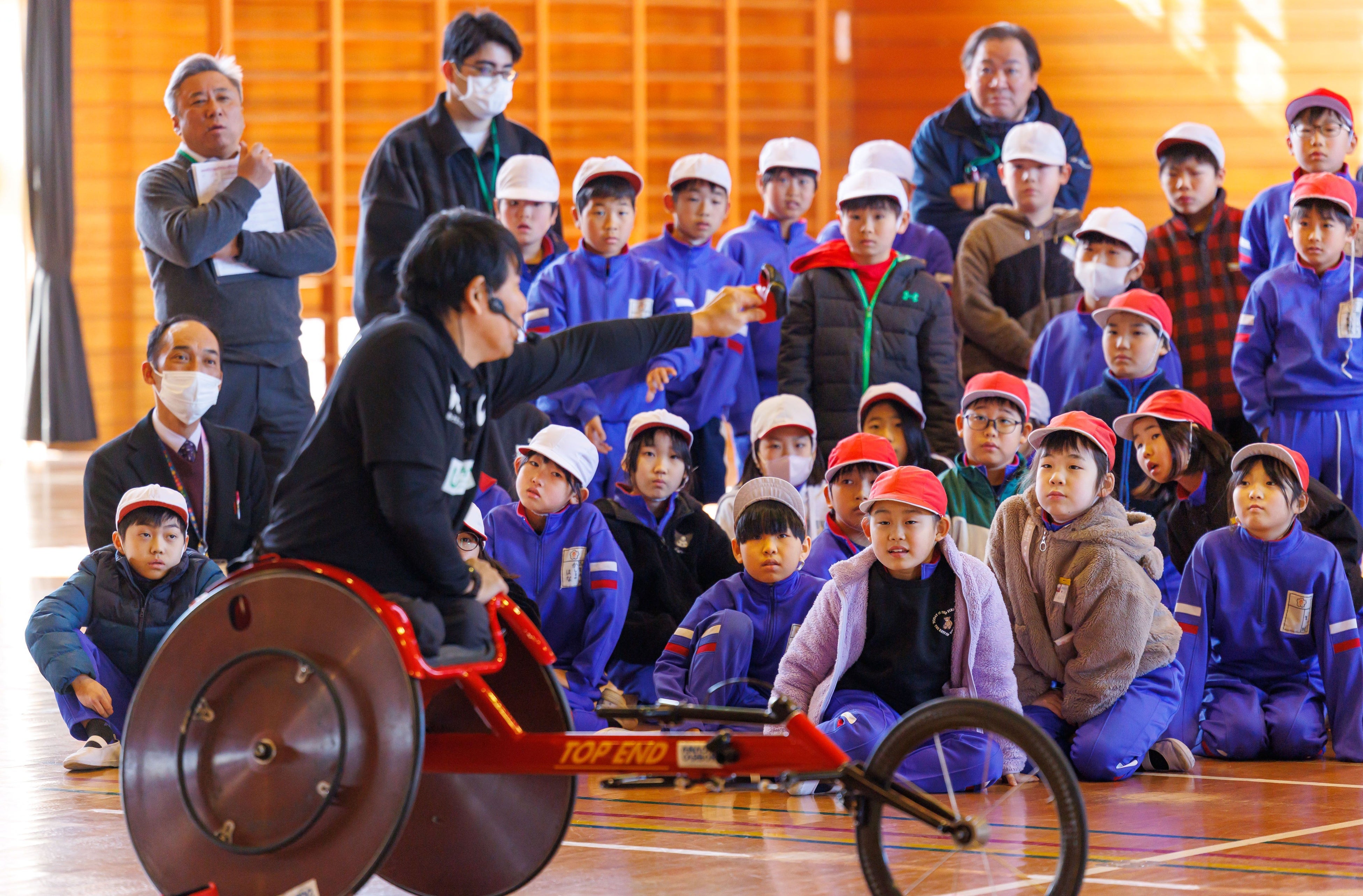 関城西小学校では永尾嘉章講師が「あすチャレ!スクール」の車いす陸上プログラムを実施。陸上競技用車いす(レーサー)のデモンストレーションで永尾講師は時速52キロのプレーを披露!