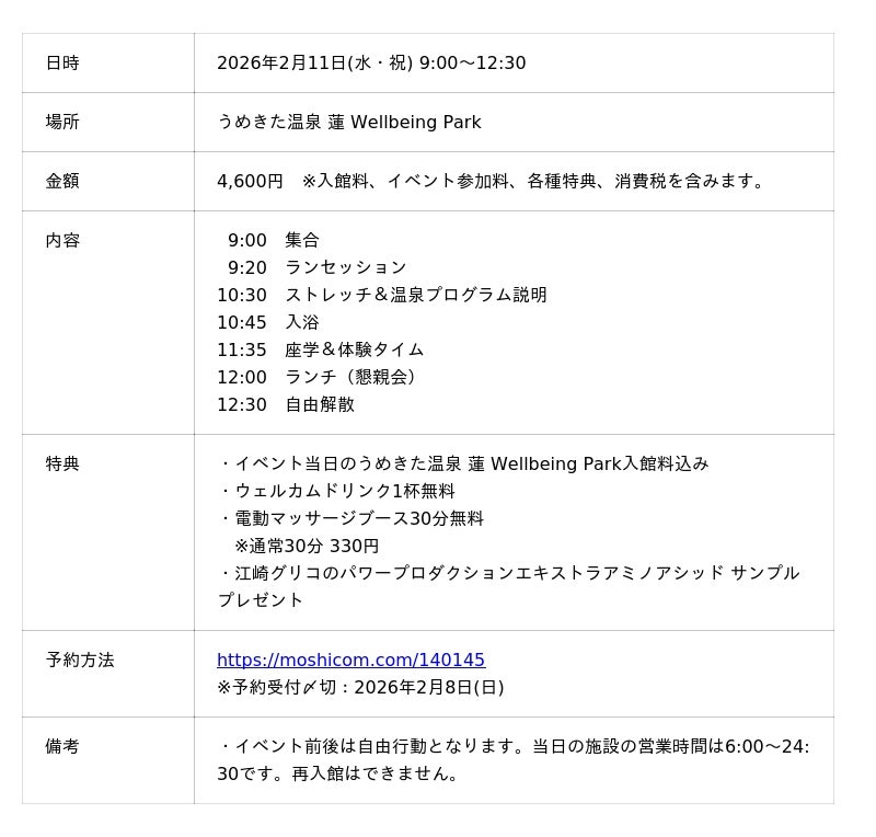 大阪マラソンまで2週間となるタイミングで、マラソンランナーが『本番を安心して迎えるため』のコンディショニング体験会です。ランニングコーチ山口 雄也氏によるアドバイスはもちろんのこと、温泉を使ったリカバリー方法、走る前後に気をつけたい食事、睡眠のコツ、簡単なセルフケアまで、難しい知識は使わず、すぐ実践できる内容をお伝えします。速く走るための特別な練習ではなく、疲れを残さない体の使い方・回復の仕方・整え方を、実際に体験しながら学んでいきます。ラン・ケア・温泉・食事までを一つの流れで体験できる、これまでにない内容です。