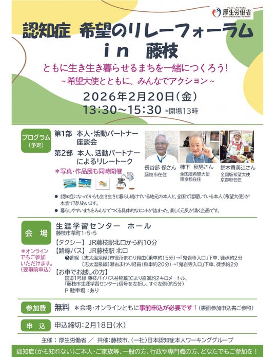 藤枝市では、昨年11月に「認知症とともに生きる共創のまちづくり計画」(認知症施策推進基本計画)を県内で初めて施行しました。多様な世代や立場の人々が認知症について学び・語り合い、希望ある認知症観の普及啓発を進めていくため、厚生労働省主催、本市および一般社団法人日本認知症本人ワーキンググループが共催による普及啓発事業「認知症 希望のリレーフォーラムin藤枝」を開催します。