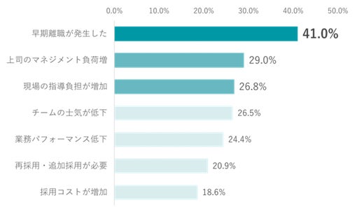 採用ミスマッチによって、実際に発生した影響について調査したところ、最多回答は「早期離職が発生した(41.0%)」、次いで「上司のマネジメント負荷増(29.0%)」、「現場の指導負担が増加(26.8%)」と続きました。採用時の見極め不足が、離職だけでなく現場全体の負荷増加につながっている実態が明らかになりました。