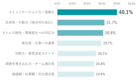 さらに、書類選考や面接といった一般的な採用プロセスでは把握しづらく、入社後にギャップを感じやすい応募者情報について尋ねたところ、最多回答は「コミュニケーション力・協働力(40.1%)」、次いで「主体性・行動力(指示待ち含む)(31.7%)」、「ストレス耐性・環境変化への対応力(30.8%)」と続きました。